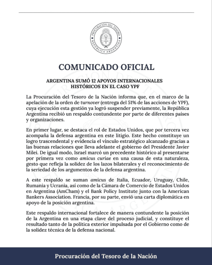 La defensa argentina en el caso YPF acaba de recibir un espaldarazo que en el Gobierno califican de “histórico”. La Procuración del Tesoro confirmó que 12 países y entidades internacionales se sumaron como aliados en la apelación contra la orden de transferir el 51% de las acciones de la petrolera.