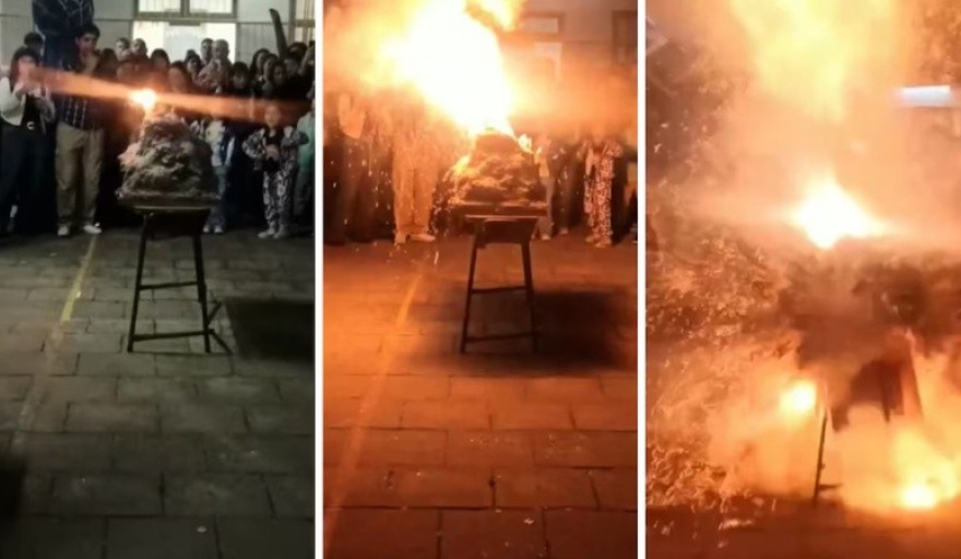 El video del momento —grabado por varios asistentes— muestra cómo, segundos antes de la explosión, una de las alumnas anuncia que “van a mezclar los componentes que forman la pólvora”, y luego el volcán detona en medio de gritos y corridas.