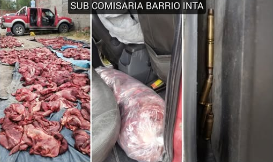 Al detener el vehículo, los agentes descubrieron bolsas de consorcio negras y bolsas transparentes llenas de carne, tanto dentro de la cabina como en la caja. Ninguno de los dos ocupantes —identificados como C.L.D. y C.M.L.— pudo justificar el origen del cargamento ni presentó documentación alguna.