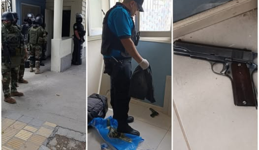Horas más tarde, cerca de las 11:50 de la mañana, personal de la Comisaría Primera, junto a la Policía Científica, irrumpió en la vivienda. Allí se identificó a dos hombres mayores de edad y se encontró un arma de fuego tipo pistola calibre .22, con cacha de madera y la inscripción “pistola automática”. El arma estaba envuelta en un pantalón de jeans dentro de una de las habitaciones.