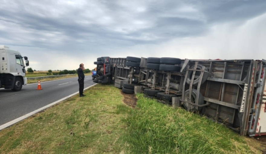 Según relató el propio transportista, un remolino en la zona de Carcarañá y Cañada de Gómez lo desestabilizó por completo. Sin intervención de terceros, el camión se desvió y quedó tumbado sobre la banquina.