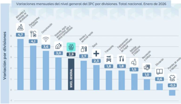 La división que más subió en enero fue Alimentos y bebidas no alcohólicas, con un 4,7%, muy por encima del promedio general. Detrás quedaron Restaurantes y hoteles, con un 4,1%.